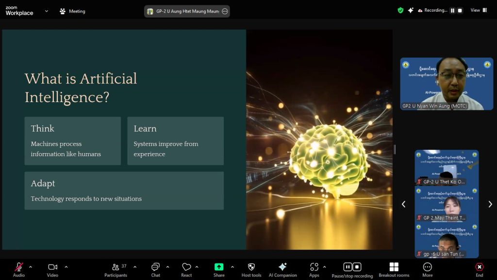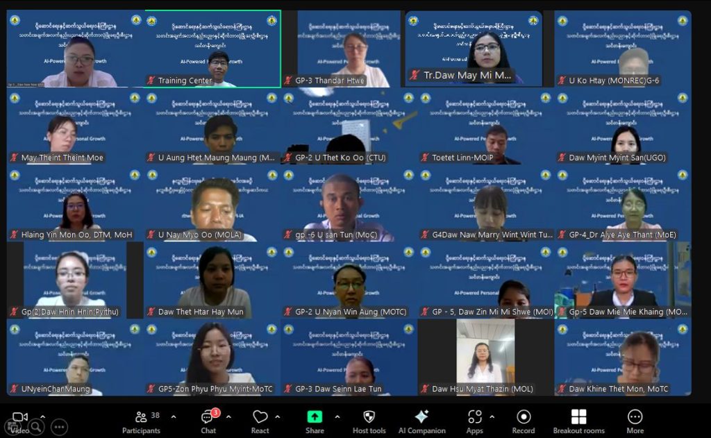 ပို့ဆောင်ရေးနှင့်ဆက်သွယ်ရေးဝန်ကြီးဌာန၊ သတင်းအချက်အလက်နည်းပညာနှင့် ဆိုက်ဘာလုံခြုံရေးဦးစီးဌာန၊ သတင်းအချက်အလက်နည်းပညာနှင့် ဆိုက်ဘာလုံခြုံရေးသင်တန်းကျောင်း၏ ၂၀၂၅-၂၀၂၆ လေ့ကျင့်သင်ကြားရေးနှစ်အတွင်း AI-Powered Personal Growth (Online) သင်တန်း၏ သင်တန်းဆင်းပွဲ အခမ်းအနားကို သြဂုတ်လ ၁ ရက်နေ့ နေ့လည်ပိုင်းတွင် Online မှ တစ်ဆင့် ကျင်းပပြုလုပ်ခဲ့ပါသည်။