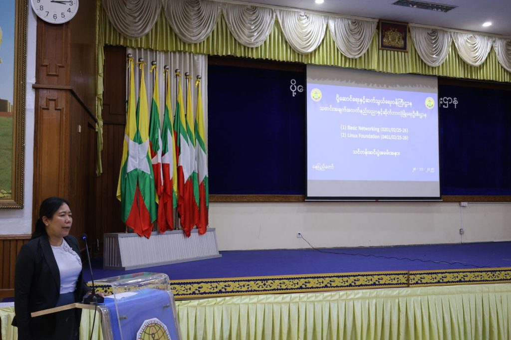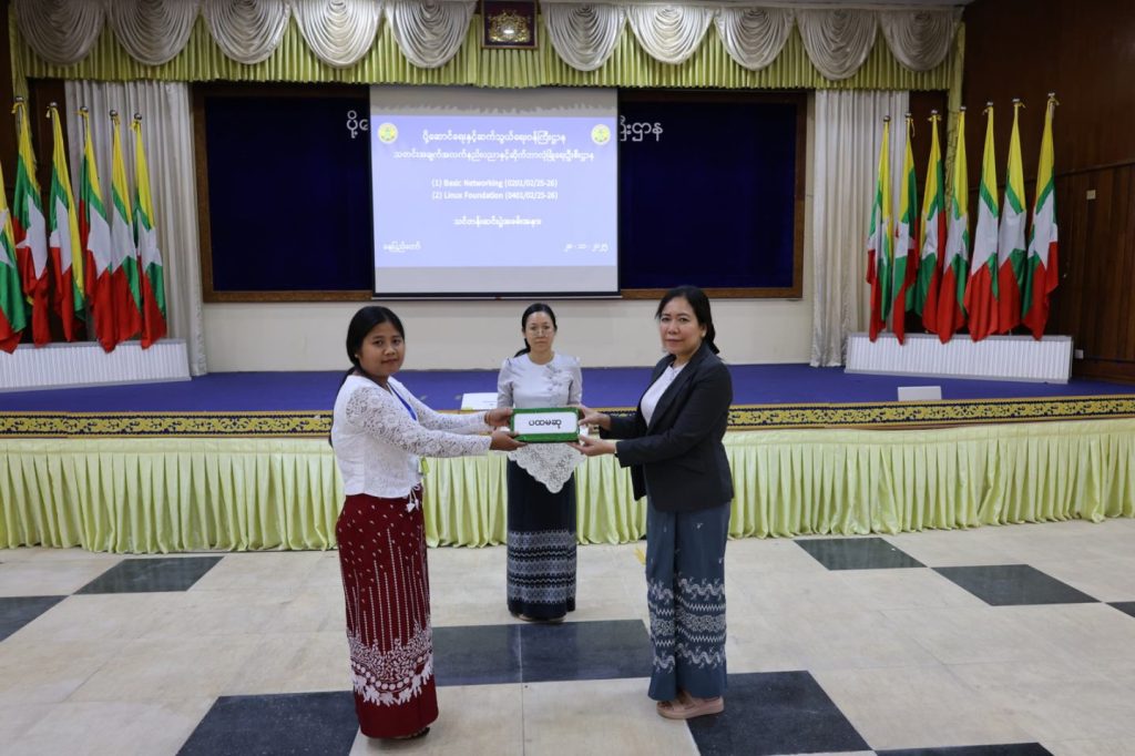 ပို့ဆောင်ရေးနှင့်ဆက်သွယ်ရေးဝန်ကြီးဌာန၊ သတင်းအချက်အလက်နည်းပညာနှင့် ဆိုက်ဘာ လုံခြုံရေးဦးစီးဌာန၊ သတင်းအချက်အလက်နည်းပညာနှင့် ဆိုက်ဘာလုံခြုံရေးသင်တန်းကျောင်း ၏ ၂၀၂၅-၂၀၂၆ လေ့ကျင့်သင်ကြားရေးနှစ်အတွင်း Basic Networking နှင့် Linux Foundation သင်တန်းများ၏ သင်တန်းဆင်းပွဲ အခမ်းအနားကို နိုဝင်ဘာလ ၂၈ ရက်နေ့ နေ့လည်ပိုင်းတွင် စုပေါင်းခန်းမတွင် ကျင်းပ ပြုလုပ်ခဲ့ပါသည်။
