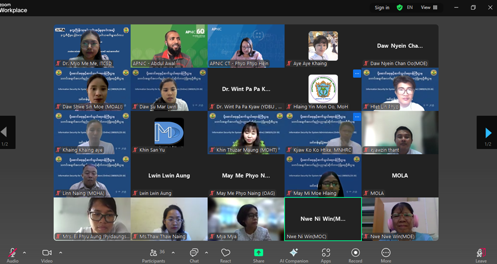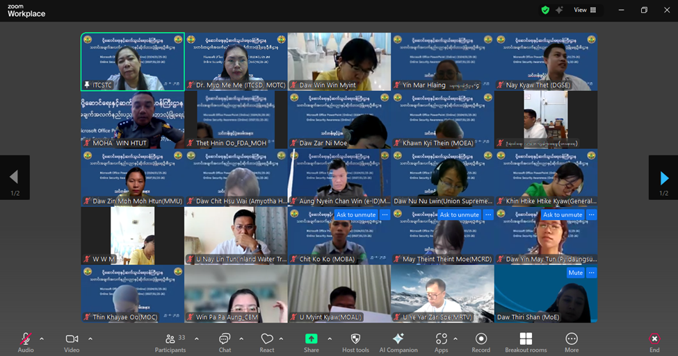 ပို့ဆောင်ရေးနှင့်ဆက်သွယ်ရေးဝန်ကြီးဌာန၊ သတင်းအချက်အလက်နည်းပညာနှင့် ဆိုက်ဘာလုံခြုံရေးဦးစီးဌာန၊ သင်တန်းကျောင်း၏ ၂၀၂၄-၂၅ ဘဏ္ဍာရေးနှစ်အတွင်း Cyber Security Fundamentals သင်တန်း၊ Windows Server Administration I သင်တန်းနှင့် Microsoft Office Word 2019 သင်တန်းများ၏ သင်တန်းဆင်းပွဲ အခမ်းအနားကို ဇွန်လ (၂၁) ရက်နေ့ နေ့လည်ပိုင်းတွင် ရုံးအမှတ် (၂)၊ စုပေါင်းခန်းမတွင် ကျင်းပ ပြုလုပ်ခဲ့ပါသည်။